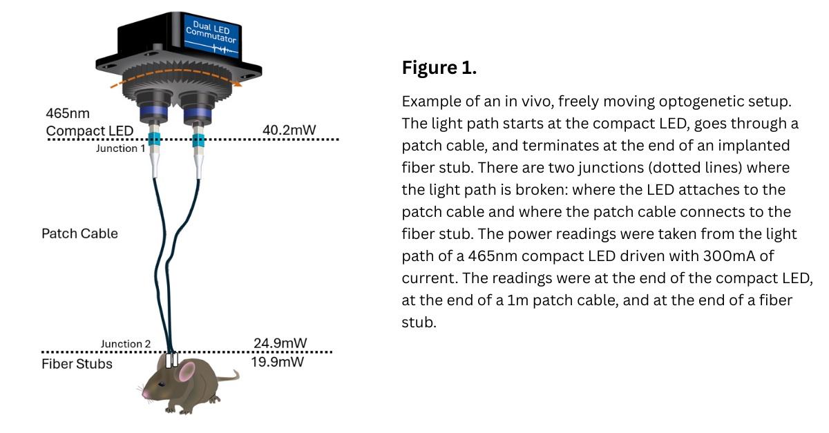 For this post, I will be referring to an optogenetic setup using Plexon’s compact LEDs, patch cables, and fiber stubs (Figure 1). In this setup, the compact LEDs magnetically attach to the bottom of a rotating commutator. The LEDs are connected to a patch cable that leads to implanted fiber stubs. This is a common setup for an in vivo experiment where the subject is awake, behaving, and freely moving. This is one setup, but there are many potential variations, which should be kept in mind as I discuss optimizing the light path. After reading this post, if you have a different optogenetic setup and would like to discuss optimizing your light path, please reach out to us at support@plexon.com.