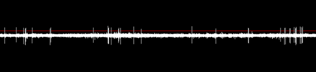 Fig 20. A strong signal-to-noise ratio allows for spikes to stand out clearly for thresholding and accurate sorting. Image taken from the timeline view of Offline Sorter after high-pass filtering wideband data.