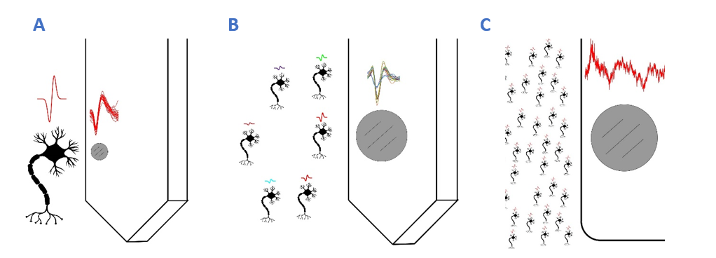 Fig 22. Unit isolation is determined by electrode size and proximity to the target neurons. A) If the electrode site is close to a neuron, and is about the same size or smaller, it will be dominated by the activity of that neuron. The signal can be filtered for field potentials, but the range will be very localized. B) If the electrode site is larger than a neuron, but on a similar scale, multiple units can be recorded on a single electrode, and filtered field potentials will cover a larger area. C) Electrodes orders of magnitude larger than a neuron will not be able to resolve single units but can see the sum of activity over a large area of cortex.