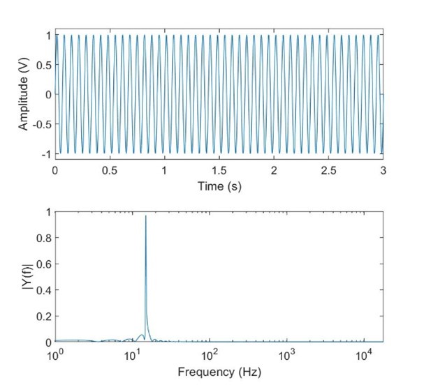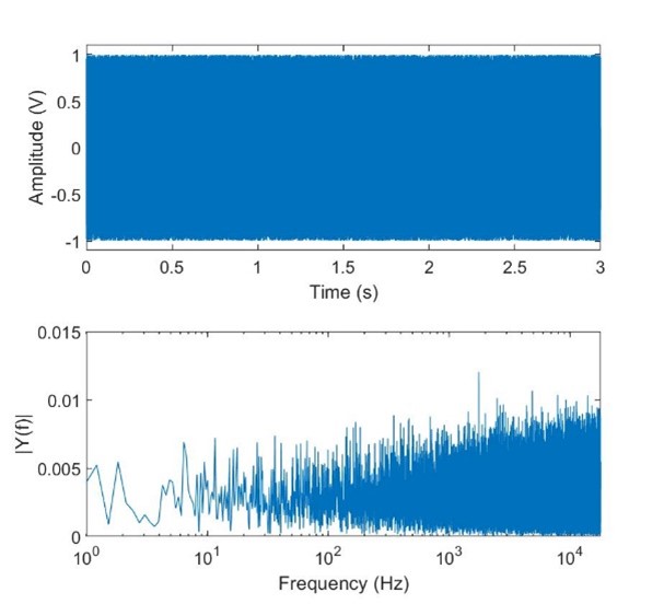 In this article we will use the Fast Fourier Transform (called FFT for short) on various signals to illustrate the effects of frequency. The FFT is an approximation of the Fourier transformation that can be done on a digitized signal with a digital processer. Fig. 13 shows a 1V, 10Hz sinusoid plotted in the time domain on the top, and frequency domain on the bottom using an FFT calculated in MATLAB. A Fourier transform would simply be a vertical line at 10Hz, with an amplitude of 1, and zero elsewhere, but the FFT approximation is more than close enough to be useful for our purposes. Likewise Fig. 14 shows approximated white noise (generated using MATLAB’s rand function). A Fourier transformation of true white noise would be a horizontal line. The FFT shows the limitations both of an FFT of a limited sample size and in digitized signals; it is limited in the higher frequencies to half the sampling rate (called the Nyquist frequency), and the power isn’t accurately measured in the lower frequencies due to the short length of time of the signal. In both cases the FFT would more closely resemble the results of a Fourier transform with a larger sample set (either by sampling at a higher frequency, or recording the signal for longer).