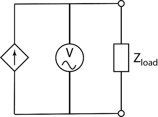 Fig 15. Simplified schematic of an impedance tester. A controllable AC current source of variable frequency is fed into the load impedance (the electrode in saline or in vivo), and a voltameter measures both the amplitude and phase of the voltage across the load. This allows both the resistance and reactance to be calculated. |