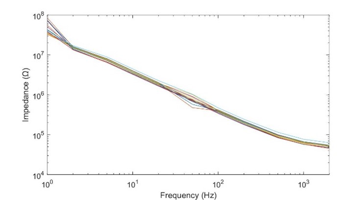 Fig 16. Impedance spectograph of a 16 channel S-probe with 15μm diameter recording sites. Recorded with a nanoZ from 1.005Hz to 2kHz. Both axes are logarithmically scaled. Notice that the impedance drops from tens of megaohms in the hertz range to tens of kilohms in the kilohertz range. |