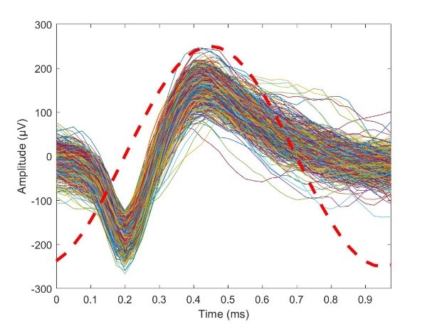 Fig 17. A pile plot of action potentials recorded from a single unit with a 1kHz sinusoid overlaid for comparison