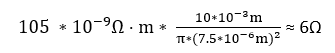 Let’s use this formula to calculate a sample impedance; let’s say for a 10mm long piece of cylindrical platinum wire, with a 15um diameter, insulated on the sides. Platinum is a metal commonly used for electrodes both for its stiffness (less likely to deform during implantation) and inertness (which increases its biocompatibility). Actually, platinum electrodes are usually a Platinum-Iridium alloy (pure platinum is much softer), but as an alloy the electrical properties can vary with alloy proportions, so for simplicity we’ll stick with pure platinum in this example, which as you’ll soon see won’t have a significant effect on the results. Platinum has an electrical resistivity of 105 nΩ⋅m, so a 10mm long platinum electrode with a diameter of 15μm (or radius of 7.5μm), insulated on the sides, would have a resistance of: