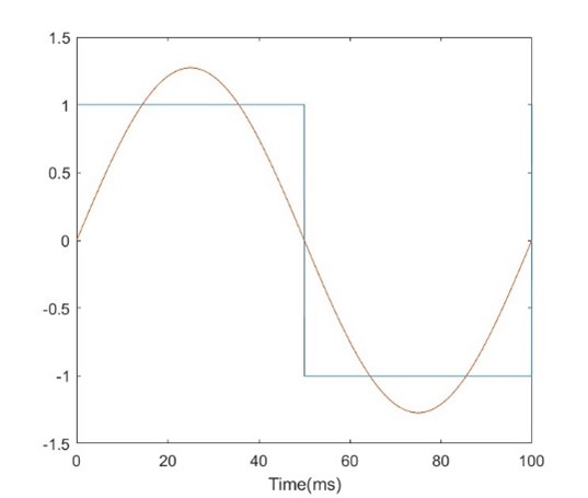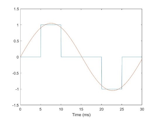 Fig 26. Comparing a square wave with a sinusoid of the same period. |