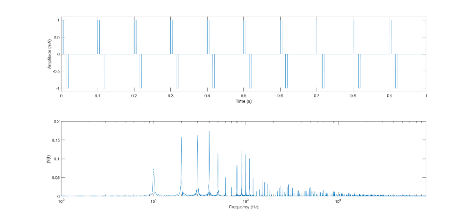 In this example the pulse frequency (100 Hz) is equal to the inverse of the pulse period since the pulses are sequential. Let’s take a look at what happens when we space out the pulses to create a pulse train with a pulse rate of a different frequency. In Fig. 28 we have a pulse train of pulses with the same amplitude and period as in Fig. 26, but with the pulses presented every 100ms (pulse frequency = 10Hz). We see that the power spectrum is more complex and spread out, however the majority of the energy is still centered around close to 100Hz (shifted somewhat to the left). There is some representation at the pulse frequency, but it is a small fraction of the total energy; we see that the pulse shape is far more important than the pulse frequency.