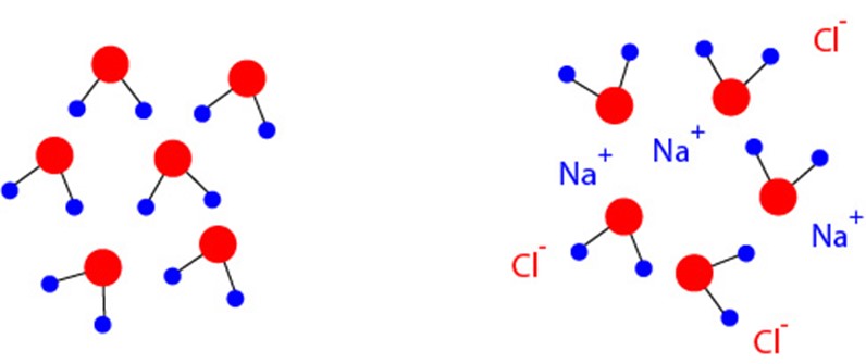 Fig 8. In pure water, represented on the left, all of the electrons are held by the potential well of the oxygen atoms (red circles), leaving the hydrogen nuclei as “exposed” protons (blue circles). This creates a strong electrostatic differential across each molecule, and there are no charge carriers to conduct current. If a salt (such as sodium chloride to make saline) is introduced to water these electrostatic gradients will pull the salts apart into cations and anions, creating free charge carriers that can move through solution to create electrical currents, as represented on the right.