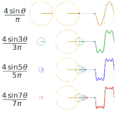 Fig 11. A square wave being approximated by the sum of the first four terms of its Fourier series. Animation from Wikipedia. |