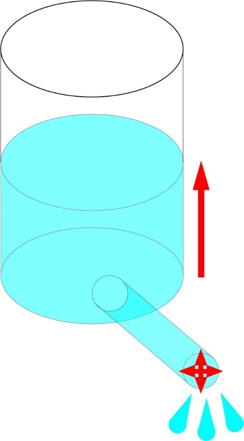 This relationship can be more intuitively understood by using what is called the hydraulic model; imagine a cylinder of water with a hose at the bottom (Fig. 1). Filling the cylinder with water will create water pressure at the opening of the hose; the higher you fill the cylinder the more pressure it will create. You can think of the pressure as potential. Water will flow out of the end of the hose, how much water flows (ie in liters per second) can be though of as current (coulombs per second). How much water the hose slows down the flow of water can be thought of is the resistance; ie a wider diameter hose will have less resistance to the flow of water compared to a thinner one (shortly we will examine the relationship between resistance and cross-sectional area of a conductive medium). Filling the cylinder to a higher level will increase the flow of water (increasing V in I=V/R) as will using a fatter hose (decreasing R in I=V/R).