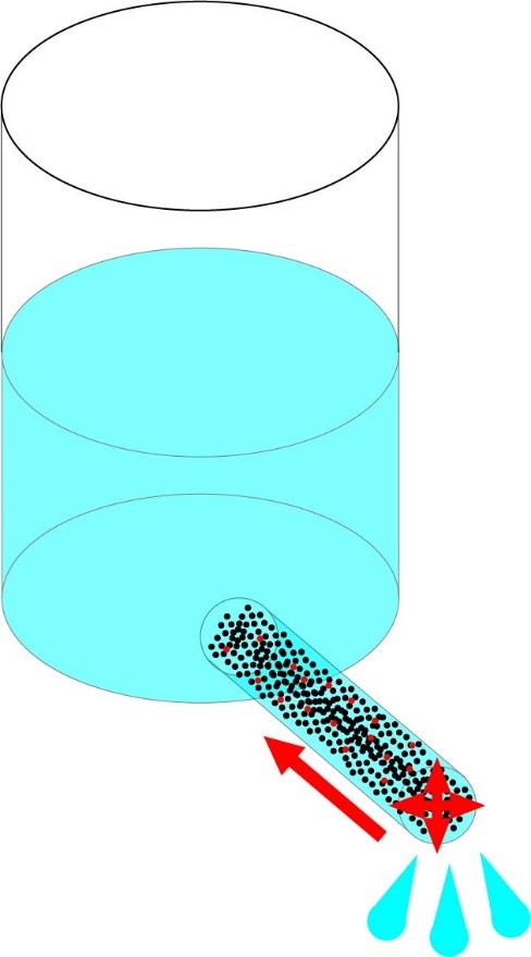 Fig 2. With a hose filled with a resistive material, such as porous stone or packed sand, flow can be increased by shortening the hose, increasing the diameter of the hose, or using a looser filling (representing using a material with reduced resistivity).