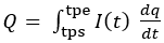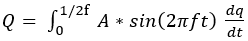 , where A is the amplitude in amps, and f is the frequenty in Hertz. Solving this integral gives us Q = A/πf.