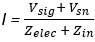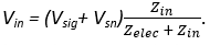Fig 20. Electrical schematic representation of an electrode implanted into a subject and connected to a headstage amplifier. The noise present in the subject (Vsn) is added to the electrophysiological signal (Vsig), and together they create a current I that runs through both the electrode (Zelec) and input of the amplifier (Zin). This creates a reduced voltage at the amplifier’s input, which is amplified along with the noise of the amplifier (Van).