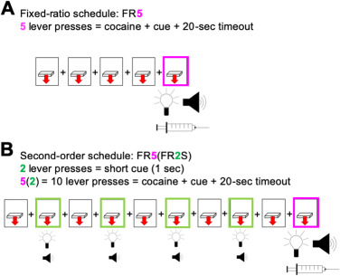 Fig. 1: Schedules of reinforcement. In this example of a fixed-ratio (FR5) schedule of reinforcement, the fifth lever press results in cocaine infusion and a 20-s timeout period during with an audiovisual cue is presented (A). In this example of an FR5(FR2S) second-order (SO) schedule of reinforcement, a brief, 1-s audiovisual stimulus (S) is presented on an FR2 schedule, and upon the fifth completion of the FR2S schedule (after 10 total lever presses), cocaine infusion and the 20-s timeout with audiovisual cue presentation occurs.